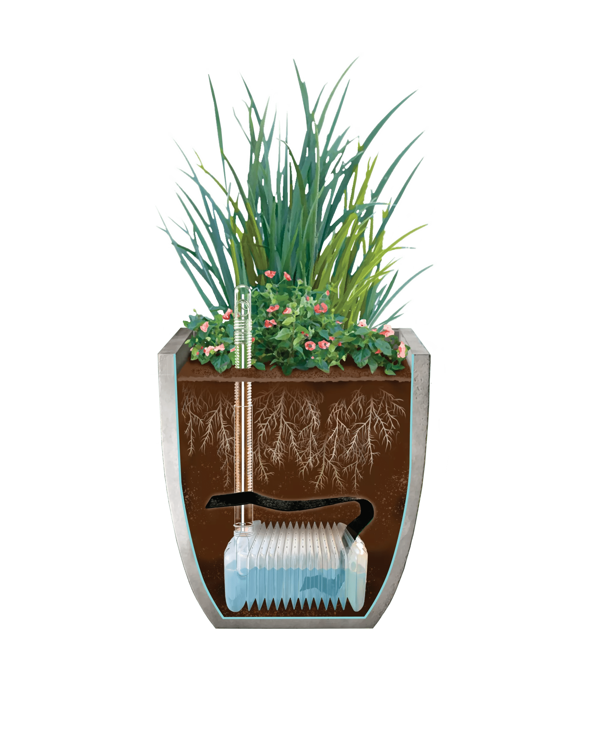 With the addition of 2 of our innovative Self-Watering Inserts, the convenience of this planter shoots up into the stratosphere, providing up to 2.5 gallons of water to keep plants happy and hydrated in two ways: wicking and evaporation. The insert has a water level indicator and an easy-fill tube to take the guesswork out of when to add water.