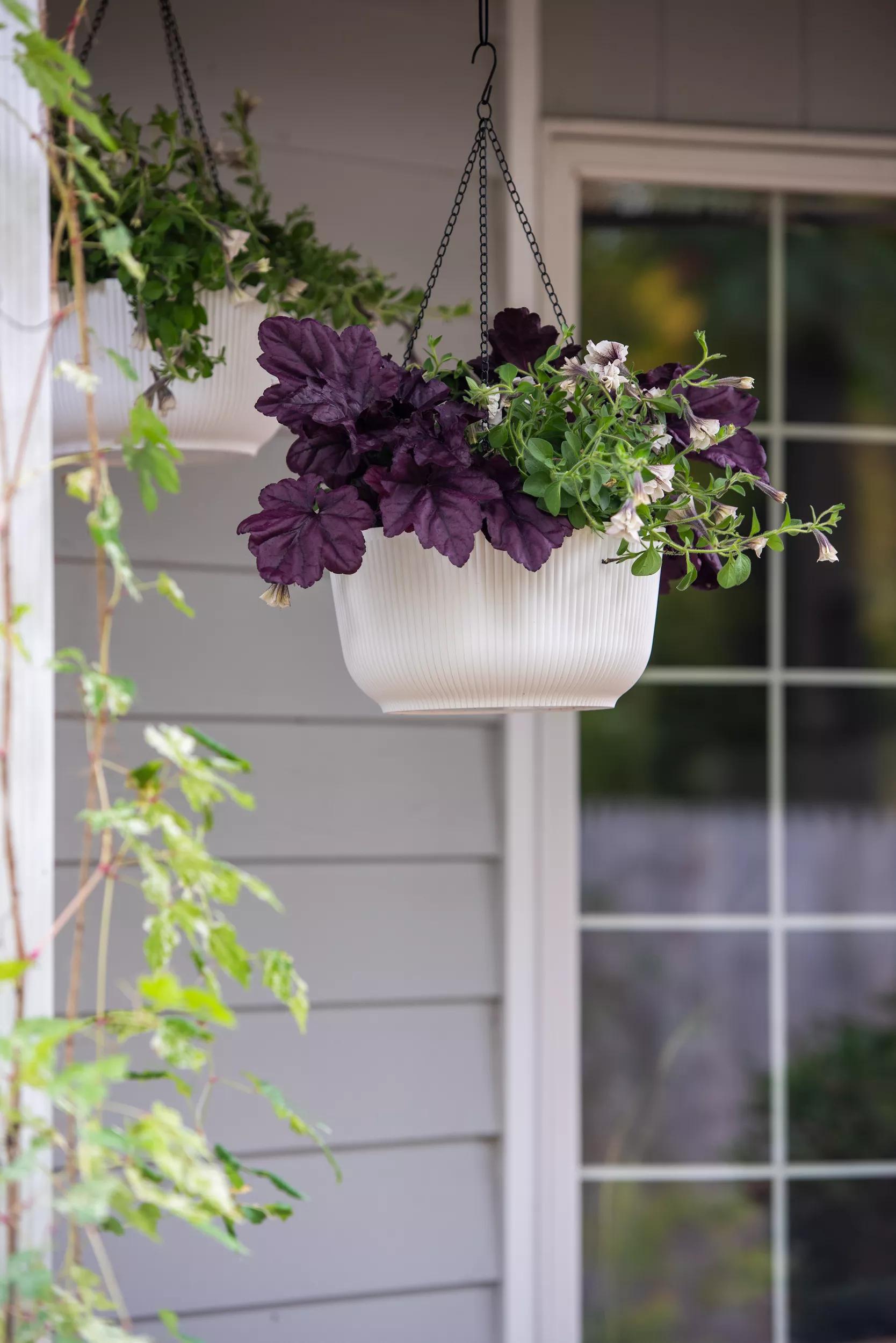 This simple and chic set of 2 hanging baskets has a modern look that can instantly elevate a space. Easily add greenery to brighten entryways! Colorfully primp the look of your porch with beautiful blooms in complementary hues! Each basket is 11” in diameter and holds 5 quarts of potting mix, so you’ve got a good amount of growing space for creative container arrangements. Best of all, the self-watering reservoir holds nearly a liter of water, keeping plants hydrated longer, lessening watering work, and maintaining a healthy and verdant vista. Add a touch of life and a burst of color with these easy to love hanging baskets!