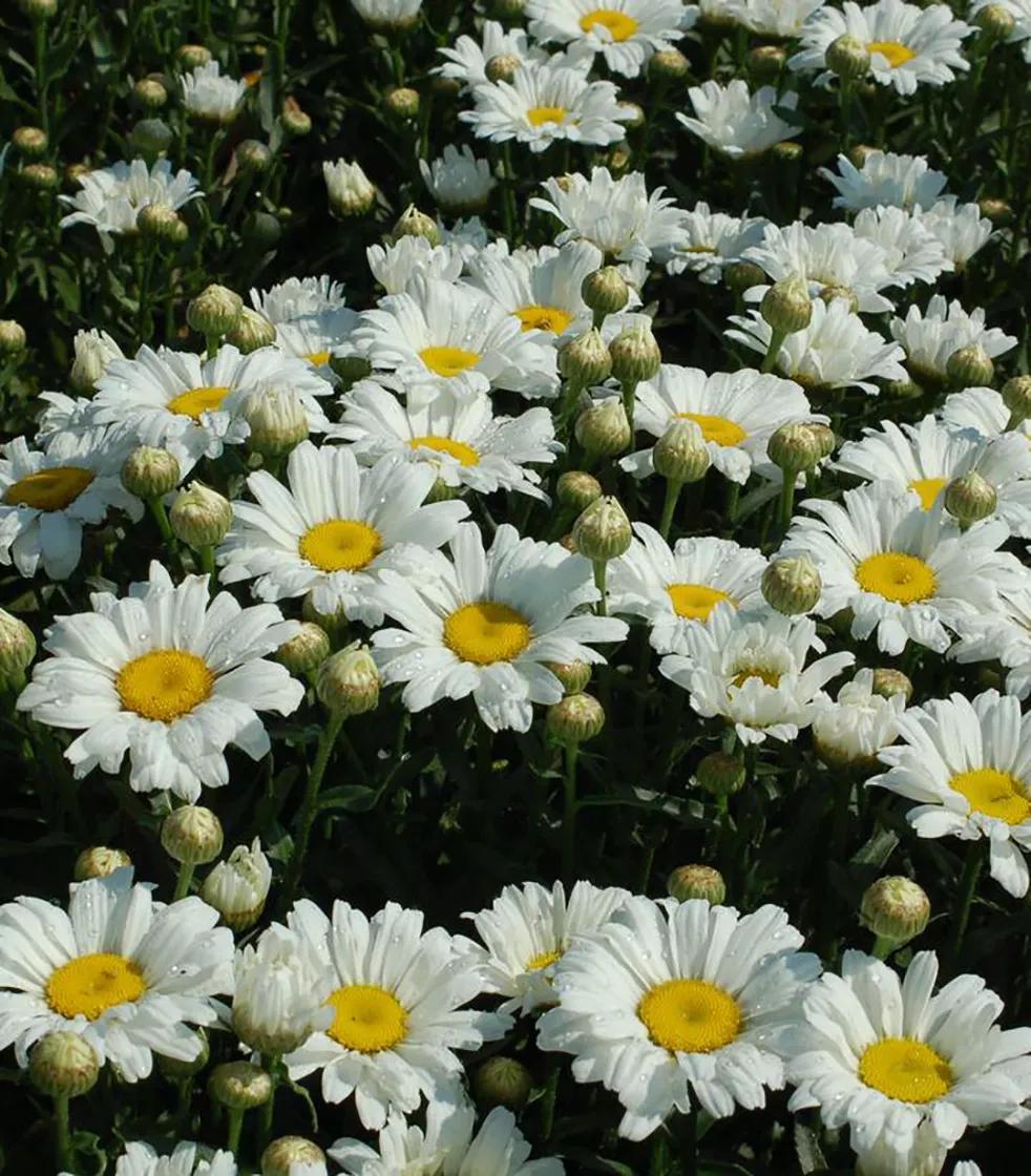 Unlike many Shasta Daisies where the flowers are thrilling but the plants are less than desirable, Daisy May is a well behaved, compact and perfectly easy plant to grow and keep in any sunny garden location. And, oh yes, its blooms are spectacular with flowers that are all you would ever want as a dyed in the wool daisy lover! Deep green, long, serrated foliage forms a dense mound that gives rise to countless bud bearing flower stems that rise nearly a foot above the foliage in early June. Flowers begin to open soon after showing off golden yellow centered flowers with pure white rays that will keep on coming well into August. With their long stems and happy faces, how could any daisy lover resist cutting them for long lasting beauty in the house? That in itself is a good reason to plant a group of these easy to grow, showy plants that want only adequate moisture and well drained soil to become your favorite Shasta Daisy.