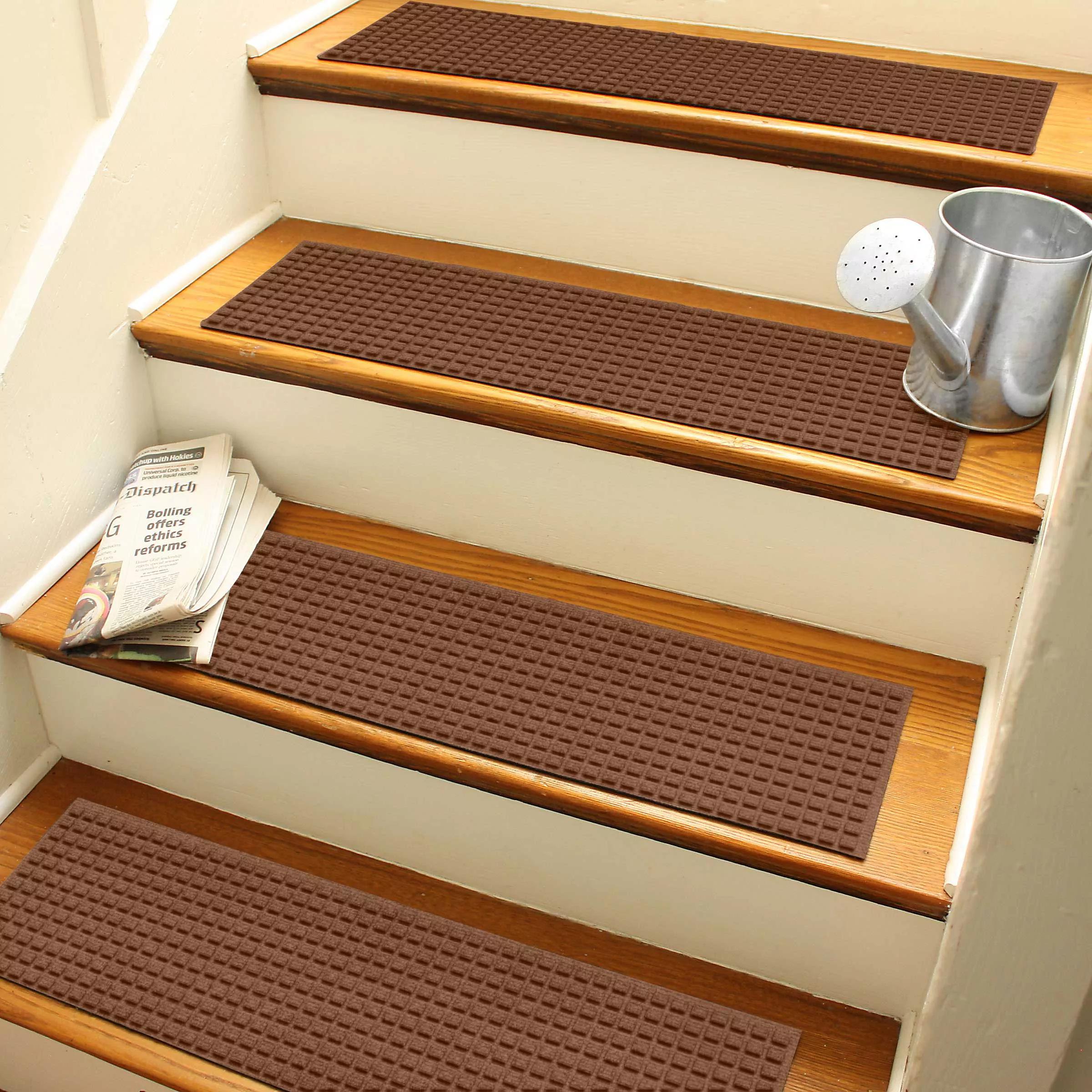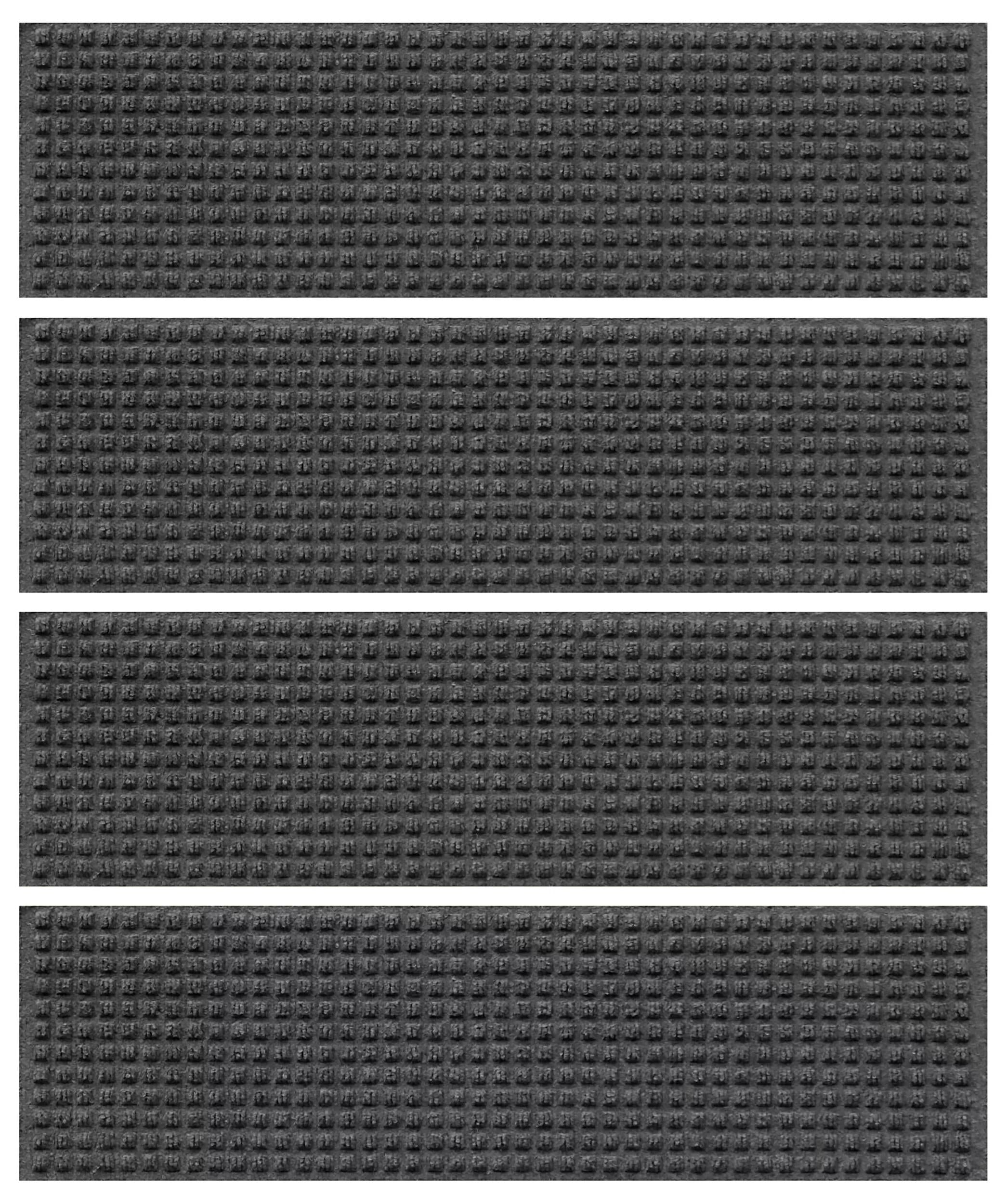 Protect your stairs from scuffs and yourself from painful slips and falls! These rugged beauties are made with commercial grade materials for tough environments. They won't fade, slip, or buckle. Built to tackle the rain, snow, mud, and other messes your loved ones track in, this set of 4 good-looking and hard-working WaterHog stair treads sport a textured design to scrape shoes clean, and a "water dam" edge to neatly contain up to 1 gallon of moisture. Made of tough, anti-static recycled polyester that dries quickly, resists mold and mildew, and won't fade or rot. A recycled rubber backing with non-slip grippers keeps these mats securely in place.