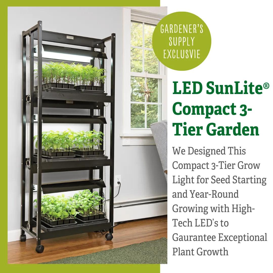 This SunLite Garden features our revolutionary LED lighting technology, creating the new gold standard for seed starting and indoor gardening. You'll be amazed at how well your seedlings, houseplants, orchids and other indoor plants grow as they bask in the glow of these specialized LEDs. The compact frame holds three light fixtures that you can easily raise and lower to the perfect height for plants.