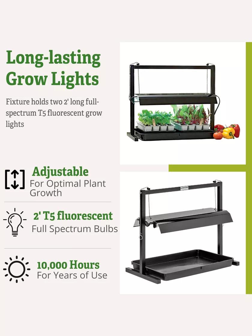 Enjoy the fun — and savings — of starting your own plants from seed. Our SunLite® Gardens give your plants the quality and intensity of light they need. You can also grow herbs, houseplants, or even try your hand at growing orchids. Our Tabletop Grow Light has a sturdy, compact aluminum frame. The low-profile light fixture holds two, 2' long T5 fluorescent bulbs that produce the full-spectrum light plants need. An attractive black finish and compact footprint make this grow light suitable for year-round use on a countertop or side table. This complete light garden includes frame, one adjustable-height fixture, two T5 fluorescent bulbs and a watertight plant tray.