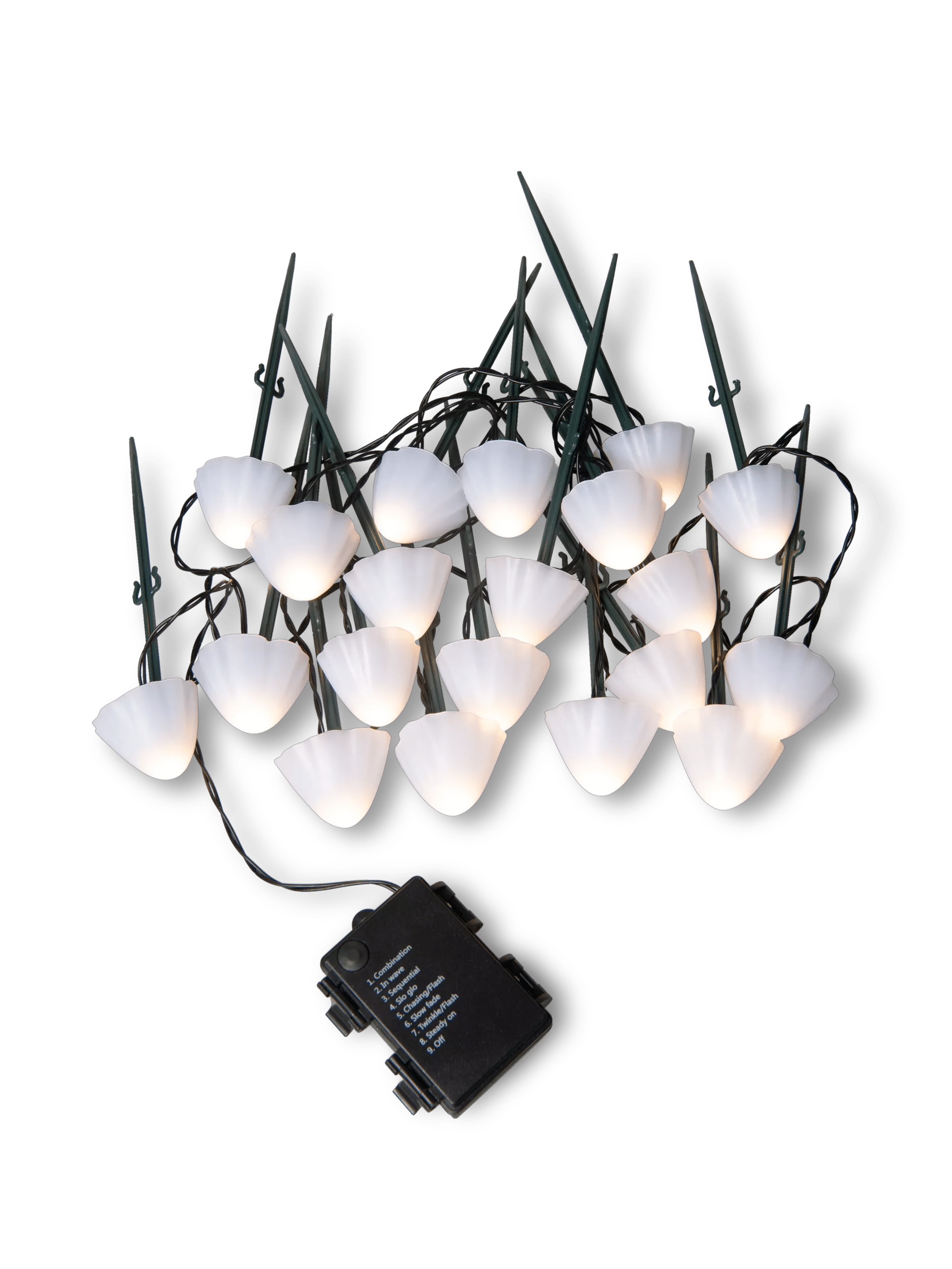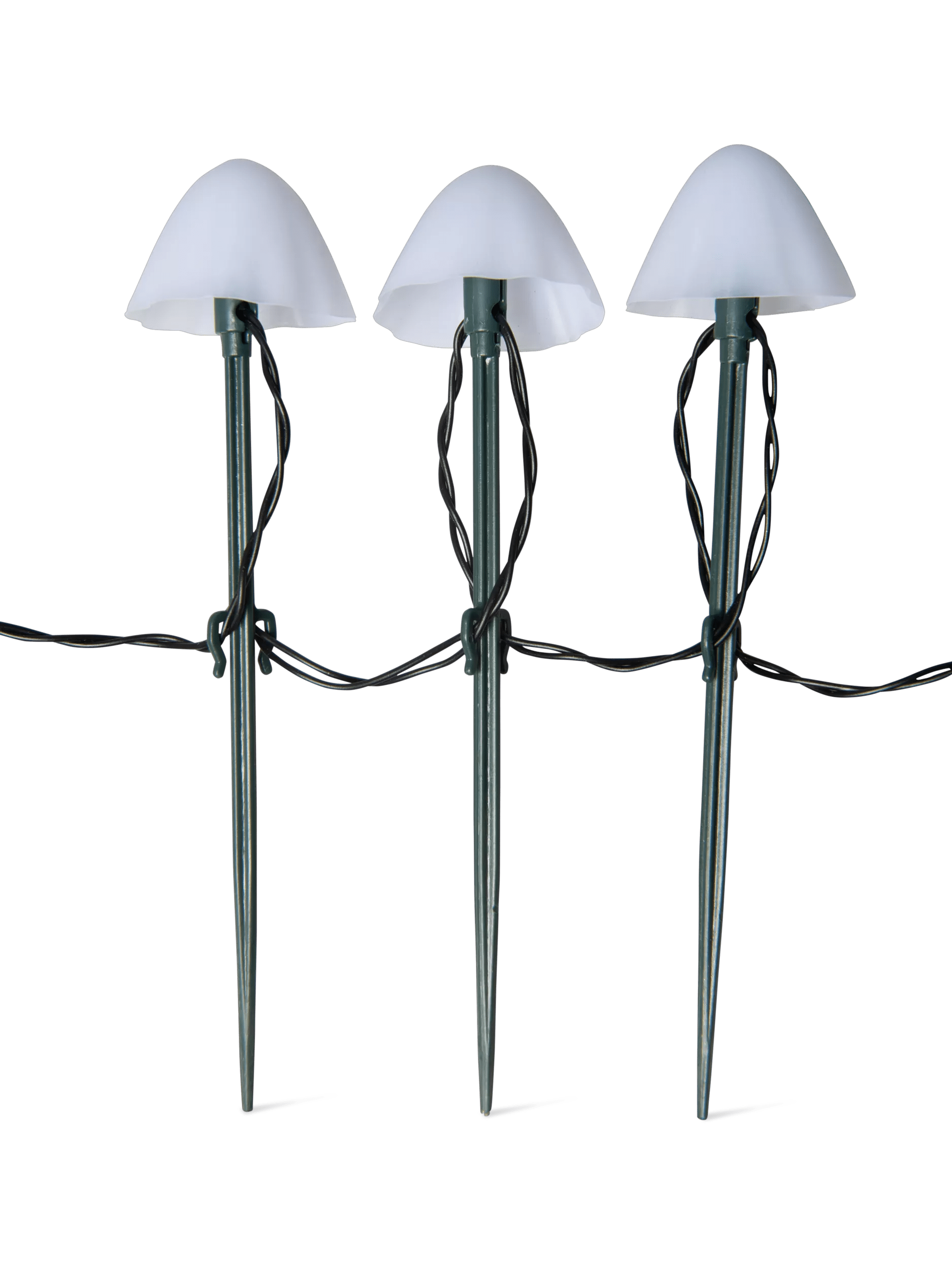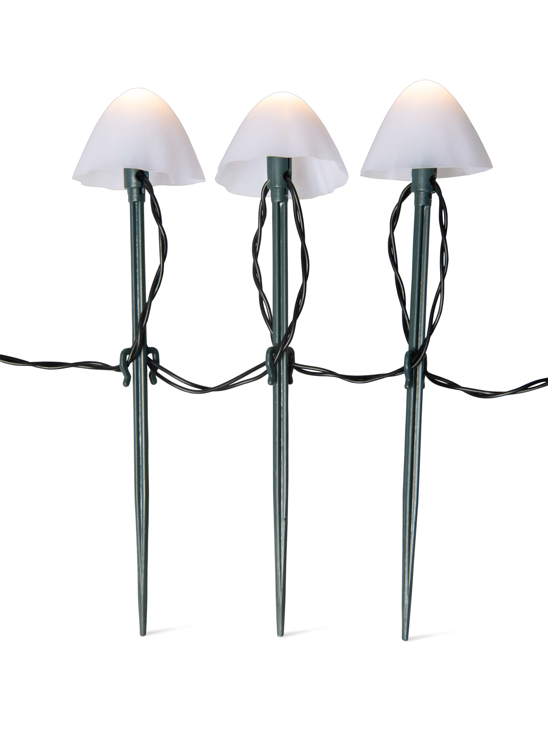 Whether tracing the edge of a path or placed among a garden bed, the glowing caps of our Tiny Mushroom Stake Lights lend a charming air of forest magic to your yard. This spellbinding string of flamboyant fungi features 20 glowing mushroom caps, each set on top of a dark green stake and lit by a warm white LED. Each mushroom is spaced 8” apart and the full string of lights is 13 feet long, including the power cord and battery pack. Choose from 8 different light settings to create a dynamic display each evening: Wave, Sequential, Slo Glo, Chasing/Flash, Slow fade, Twinkle/Flash, Combination, and Steady On.