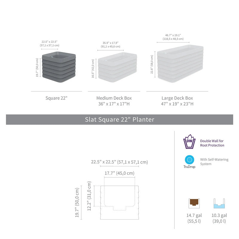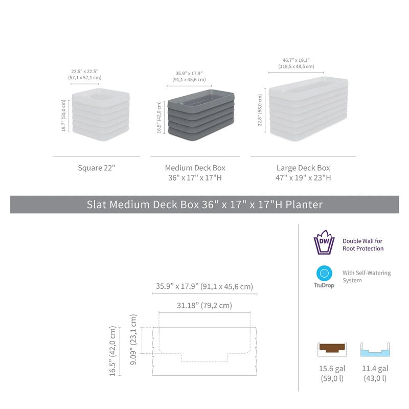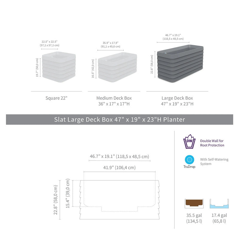 Unlike traditional designs, this planter boasts a spacious single-compartment layout, enhanced with the latest TruDrop self-watering technology for unparalleled innovation. Discover the perfect blend of timeless aesthetics and modern functionality in this state-of-the-art self-watering planter box. Versatile for both indoor and outdoor use.