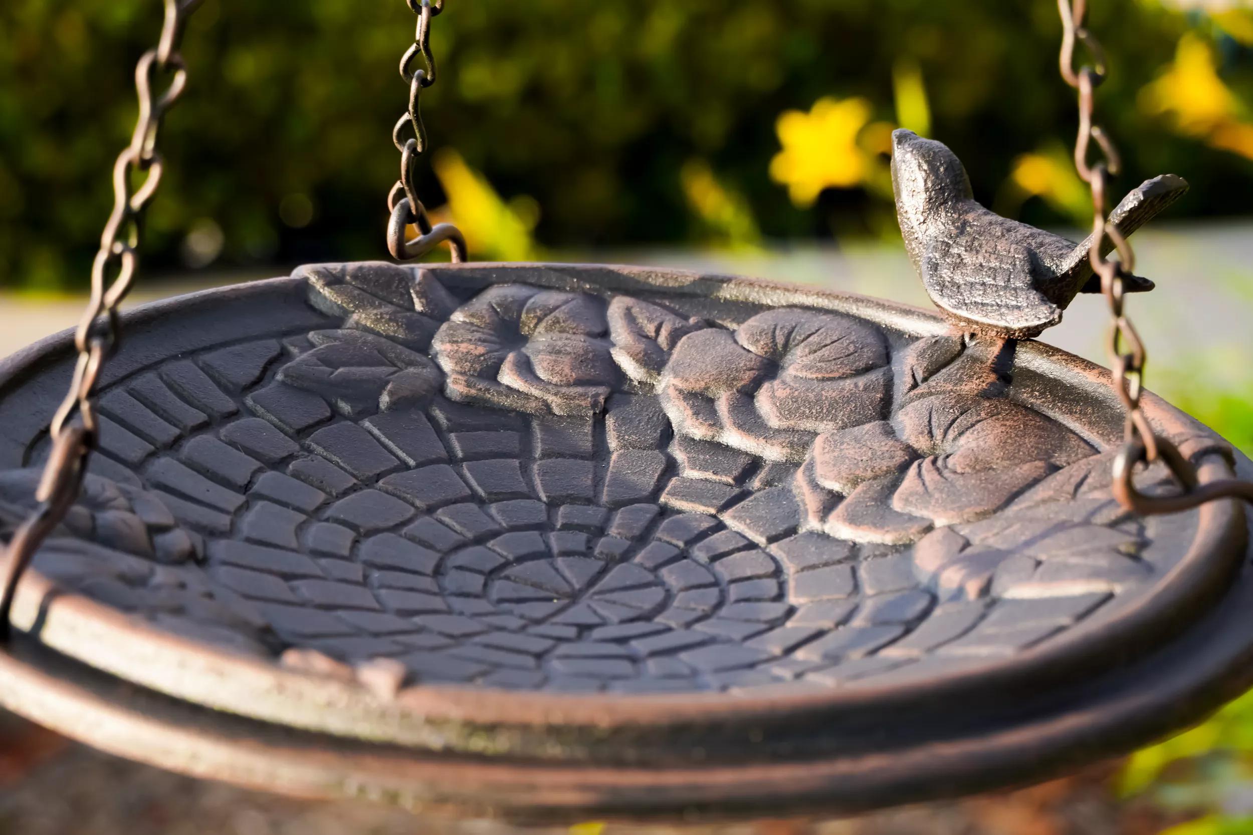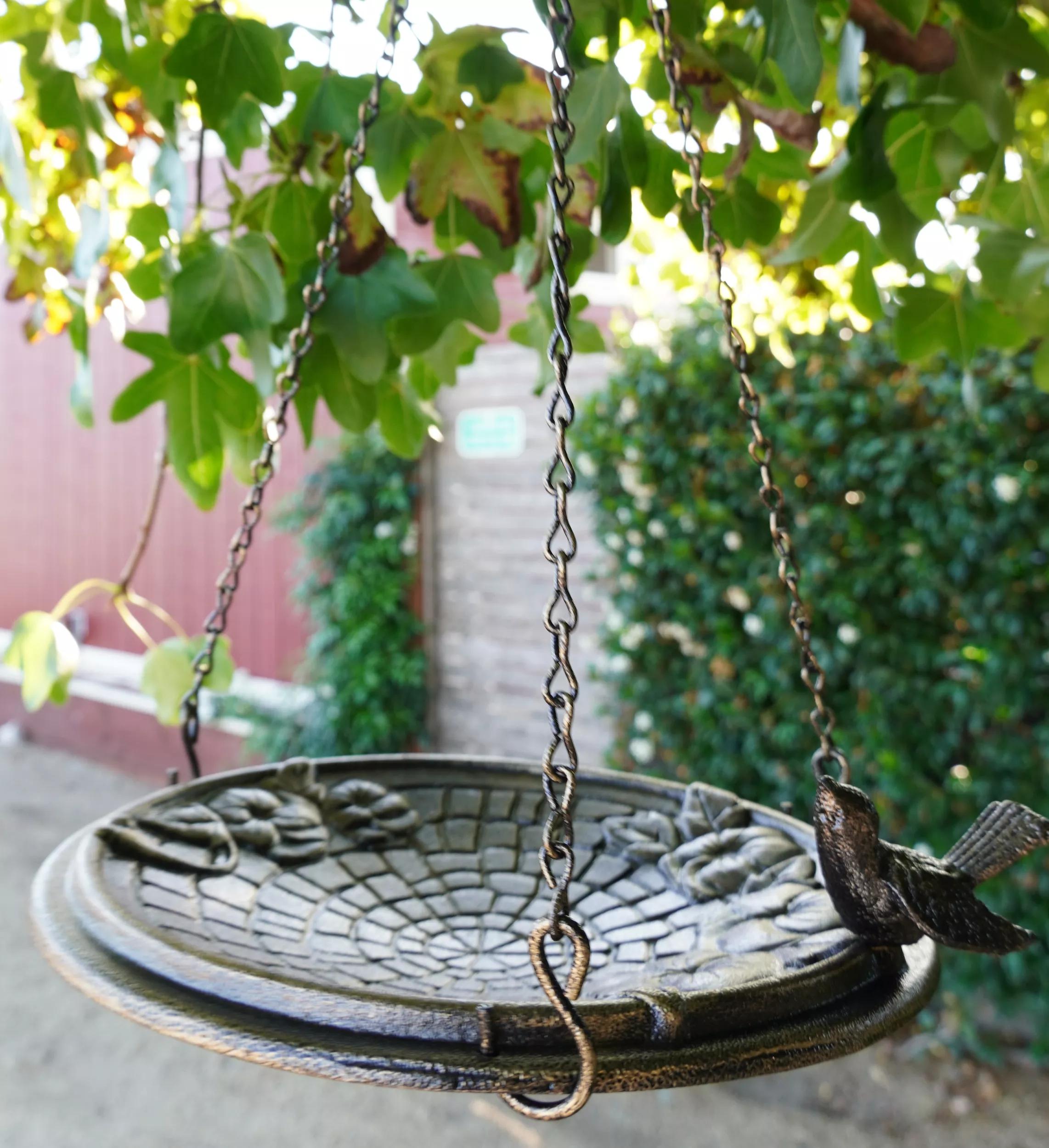 Charm with a bit of whimsy, this bird bath top is cast from rust free aluminum. The hanging chains make these a swaying bath that the birds are sure to enjoy. Durable power coat finish. This bird bath is a perfect addition to any outdoor landscape or garden and will be enjoyed by your feathered friends for years to come.