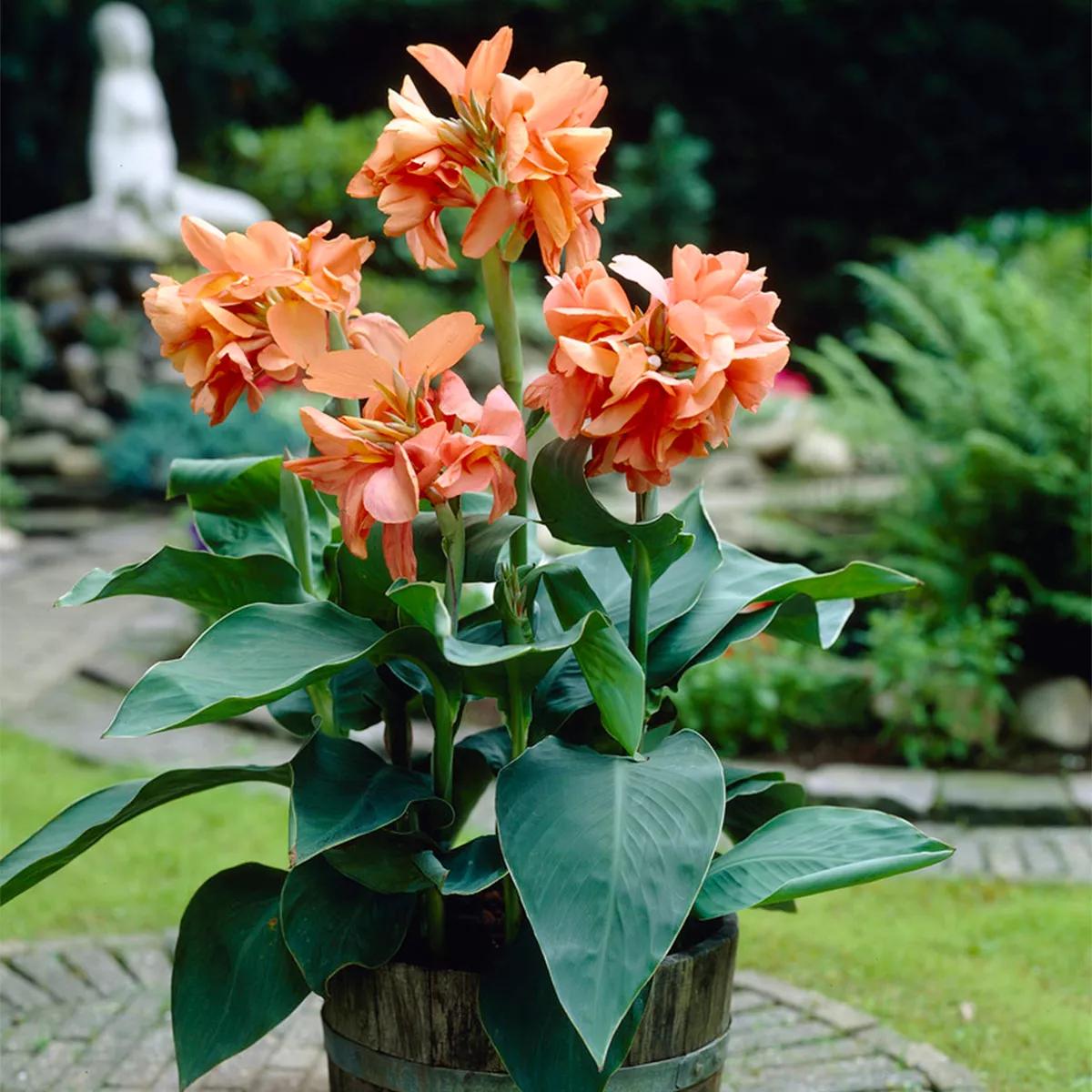 Tropical Sunrise cannas are dwarf in stature and what makes them special are its blooms of blushing apricot mingled with soft pink. Creates a real tropical theme in the garden.