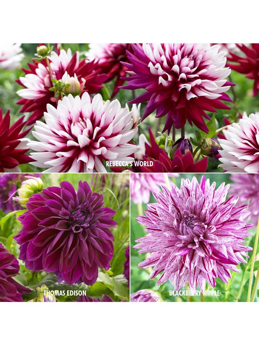 Growing dahlias is very easy when grown from our tubers (bulbs). and we guarantee them to grow and bloom. If you have been to a state fair, you have probably seen a pavilion filled with these exotic amazing blossoms. Collected by many gardeners, they make for sturdy varietal plants and are excellent in perennial borders. Growing them will likely lead to a hobby as the spectacular blooms are addictive and quite versatile in the garden. They can also be grown as pot plants. A gardening expert once said of dahlias, "Never have so many enjoyed so much with so little time and work". He was right! Plus, they are inexpensive. It is also the national flower of Mexico. This Dahlia Collection packs some bold color for the collector and lover alike, consisting of the following varieties; Rebecca's World, Thomas Edison, and Blackberry Ripple. 5 clumps of each variety, which are individually packaged and labeled.