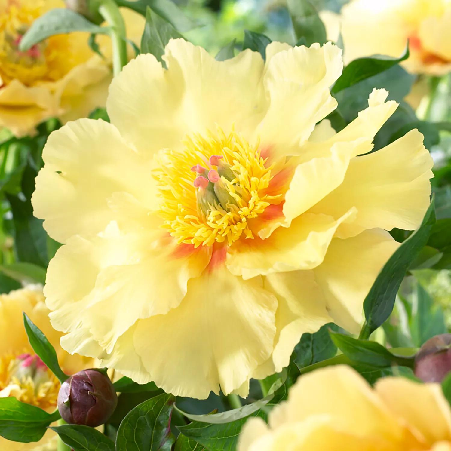 Peonies are perennials and are known to live for decades, even generations. The blooms are outrageously beautiful, producing lush, glossy green foliage all summer long, turning purplish or gold in the fall. Itoh type Peonies are bred by cross breeding herbaceous type Peonies with tree Peonies, creating a new hybrid. In the old days they sold for as much as $1,000.00 each, but these days are much more affordable. They are somewhat more expensive to propagate, but well worth the investment in your garden. Itoh Peony Garden Treasure features large yellow, semi double flowers. Known for its huge flowers. Leaf color changes throughout the season. As a hybrid it combines the best qualities of its parental varieties. Said to be slightly fragrant. Many buds per stem.