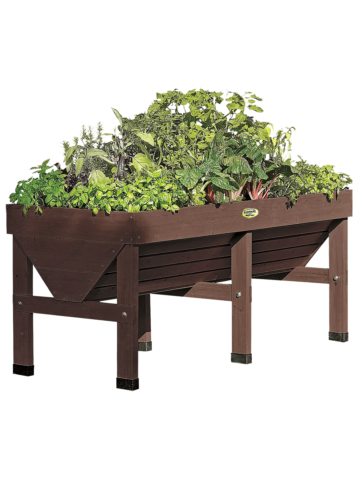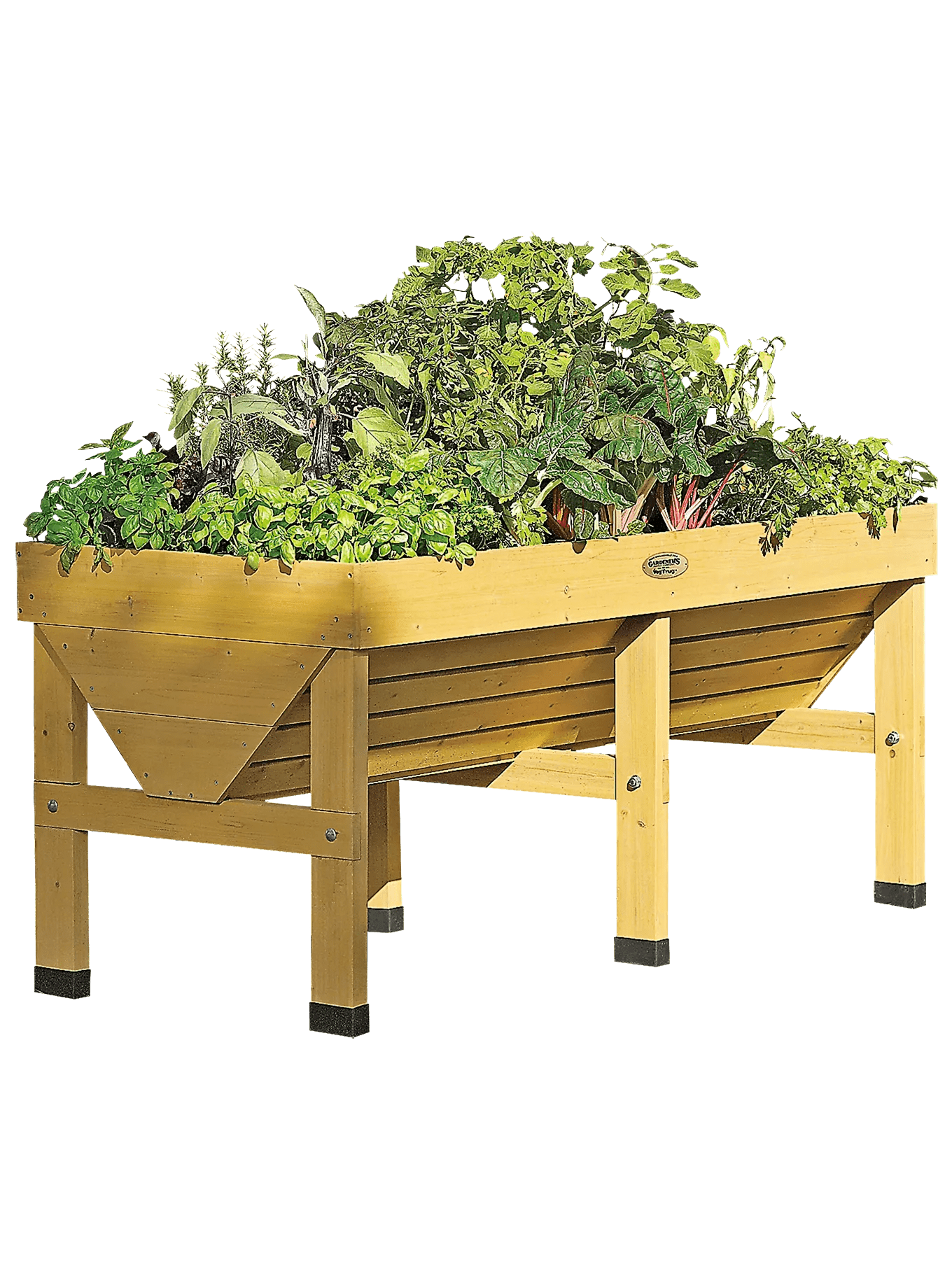 Grow plants at an easy working height in this unique patio garden; no bending or kneeling to plant, tend and harvest. The elevated bed means no weeds and fewer pests, too. The V-shape makes efficient use of space and planting mix — grow deep-rooted plants like tomatoes in the center, shallow-rooted crops like salad greens along the edges. Includes a fitted fabric liner to keep soil contained while letting excess water drain. Plastic feet protect wood from wet surfaces. Quality construction and easy assembly.