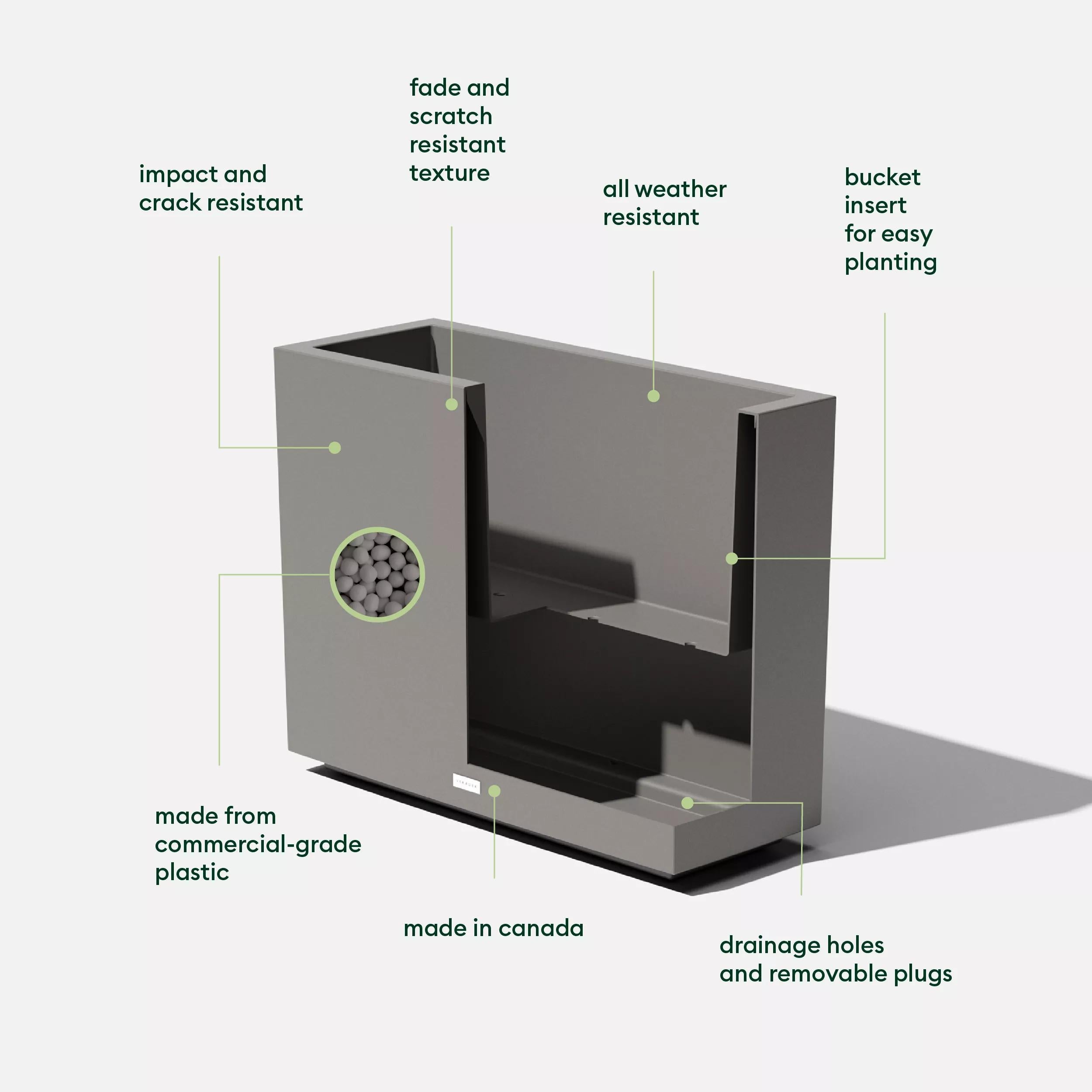 Tall and sleek, the Span planter is the perfect addition to any front entrance, deck or patio. Featuring a modern modular design, the Span planter is ideal as a patio accent or as a divider piece to add much needed privacy to your outdoor space. Crafted from commercial grade plastic (polypropylene) and made in Canada, all Veradek Block series planters are proven to resist weather related splitting and cracking – both in Winter and Summer. All Block series planters are solid, yet lightweight and are protected by UV inhibitors to ensure that fading is not an issue in the hot summer months. In addition, all Span planters are made with a removable insert bucket to make planting quicker and easier. With a Veradek product, you can rest assured that you are receiving the perfect balance of design, durability and convenience.