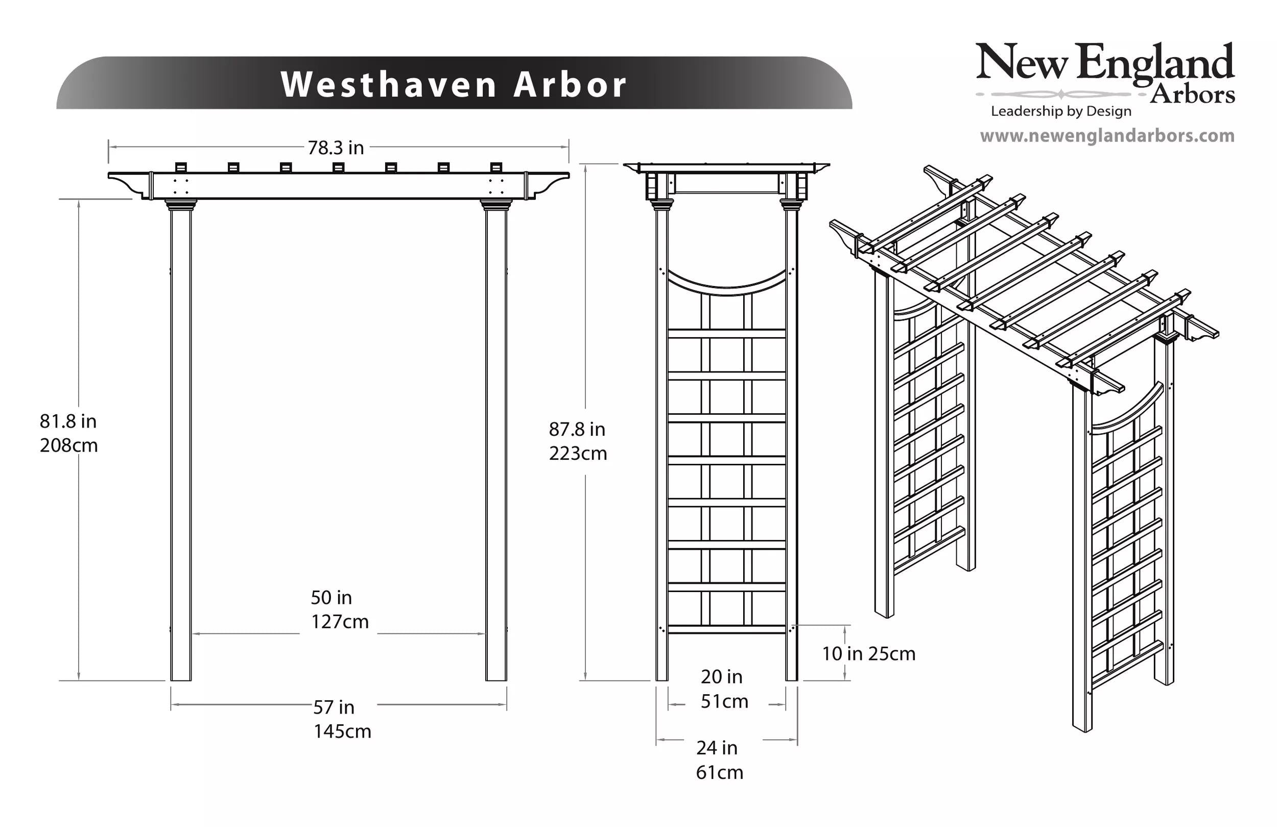 Distinguished and substantial, the Westhaven Arbor will create an impressive entrance to any path or walkway. The adjustable opening was designed to span a sidewalk from 50” to 54" wide. The stately Westhaven Arbor is made of premium weather-resistant vinyl and is maintenance-free. No need to ever stain, paint, or maintain your arbor again! You get the classic look of wood without the headaches. Just the occasional rinse with a garden hose is all you need to do to keep your arbor looking great year after year. Arbor opening is adjustable up to 50” wide, overhang is 35” deep and posts are 2” x 3.5”.