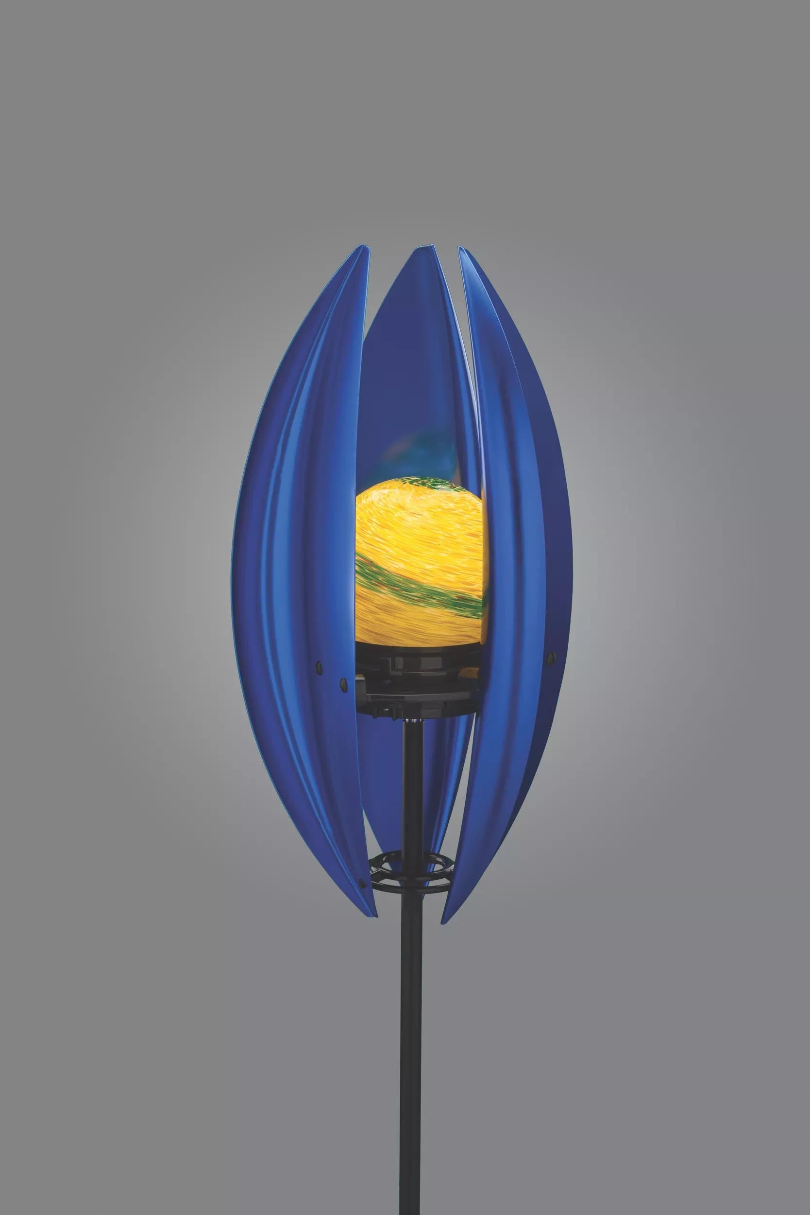 This compact and elegant design uses an energy-producing wind turbine to generate and store power to illuminate a decorative glass globe at night.